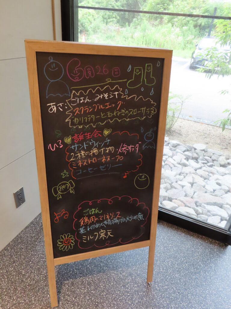 食堂 2026 3/11 施設からのお知らせ 2025-03-122026-03-11 天井を高くし解放感のあるカフェスペースをイメージした食堂にしました。 栄養士が毎日献立を手書きしており、利用者さんも食事が一層楽しみになっています。 月に一度は誕生日会が開かれ、利用者さんに人気のある献立を提供し、利用者さんも大変喜ばれています。 施設からのお知らせ